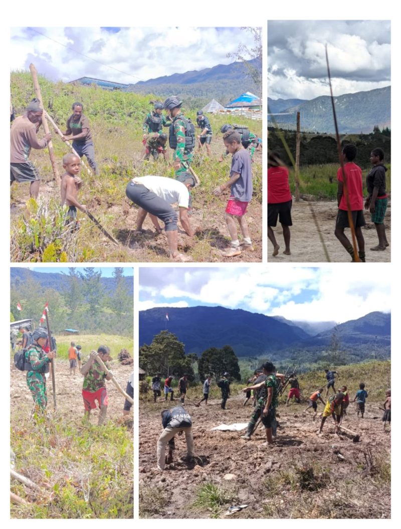 HARIAN PERS //Dalam rangka meningkatkan kesejahteraan dan kebersamaan masyarakat di wilayah Papua, Satuan Tugas Mobile Raider 300 Siliwangi Pos Eromaga yang dipimpin oleh Letda Inf Didin melakukan kegiatan pembangunan lapangan volly di Desa Eromaga, Distrik Ilaga, Kabupaten Puncak, Papua dengan melibatkan anggota Satgas dan masyarakat setempat.