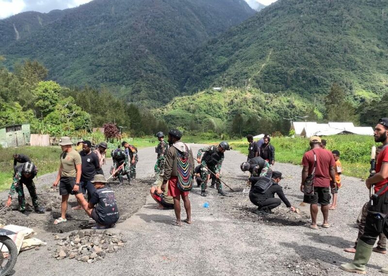 Harianpers.com | Sebanyak 30 orang anggota Satgas Yonif R 300/BJW yang dipimpin oleh Letda Inf Lubis melaksanakan kegiatan Gotong Royong Pembenahan Landasan Peswat bersama dengan aparat kampung (Apkam) setempat dan masyarakat kampung Milawak, Distrik Beoga, Kabupaten Puncak, Papua.