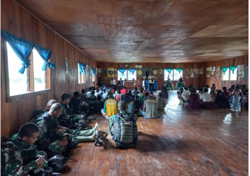 HARIAN PERS | Satgas TNI 300 Siliwangi yang bertugas di wilayah Distrik Wuloni, Kabupaten Puncak, Papua, melaksanakan ibadah bersama dengan masyarakat setempat di Gereja GKI Mageabumek. Kegiatan ini merupakan salah satu bentuk sinergitas dan kepedulian TNI terhadap masyarakat di Papua.