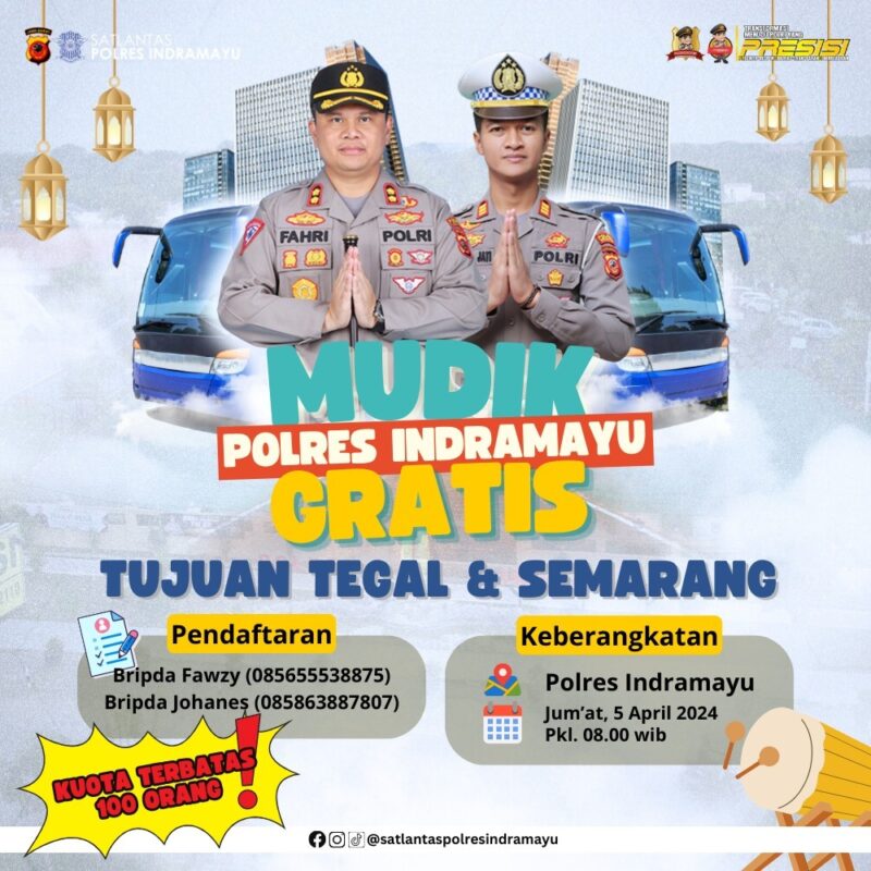Harianpers.com – Indramayu, Satlantas Polres Indramayu jajaran Polda Jabar mengadakan program mudik gratis ke Tegal dan Semarang, Jawa Tengah, dengan biaya gratis.