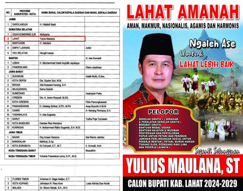 Dalam surat rekomendasi tersebut, untuk Sumatera Selatan ada empat calon Bupati yang sudah direkomendasikan. Untuk Kabupaten Banyuasin ada nama H Askolani, Kabupaten OKI ada nama Abdiyanto, Kabupaten Lahat ada Yulius Maulana, ST dan OKU Selatan ada Hengki Irawan.