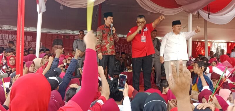 Sambutan Ketua PDI-Perjuangan Provinsi Sumatera Selatan [SUMSEL] Giri mengucapkan terima kasih kepada ribuan masyarakat yang telah hadir dan hari ini bersama-sama berkumpul mengantar ke KPUD Lahat dan siap untuk memenangkan pasangan YMBM “Ngale Aseh,”