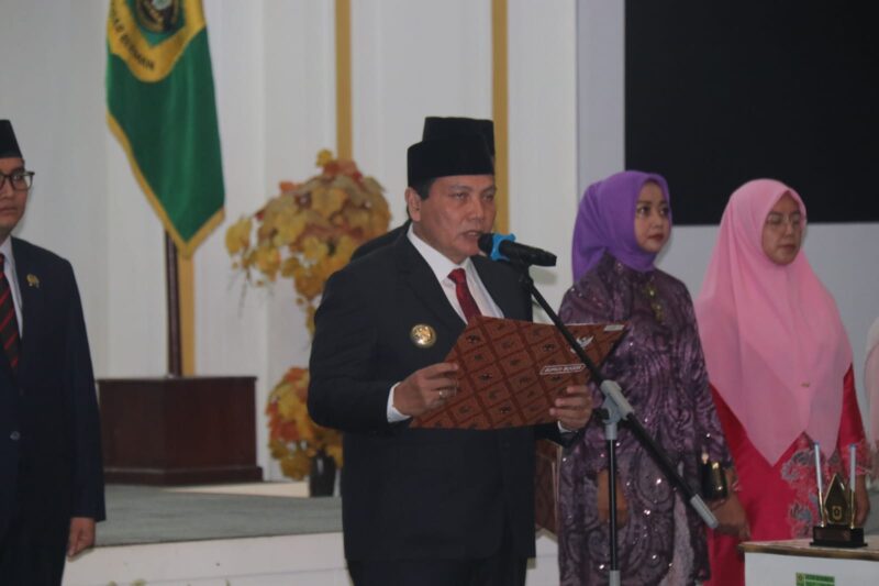 CIBINONG- Pj. Bupati Bogor Bachril Bakri resmi melakukan pengambilan sumpah janji dan jabatan Sekretaris Daerah Definitif terhadap Ajat Rochmat Jatnika menggantikan jabatan Pj. Sekda Kabupaten Bogor, Suryanto Putra yang berlangsung di Gedung Tegar Beriman, Cibinong Jumat (11/10/24). Kini Pemerintah Kabupaten (Pemkab) Bogor memiliki nahkoda baru di jajaran birokrasi Bumi Tegar Beriman.