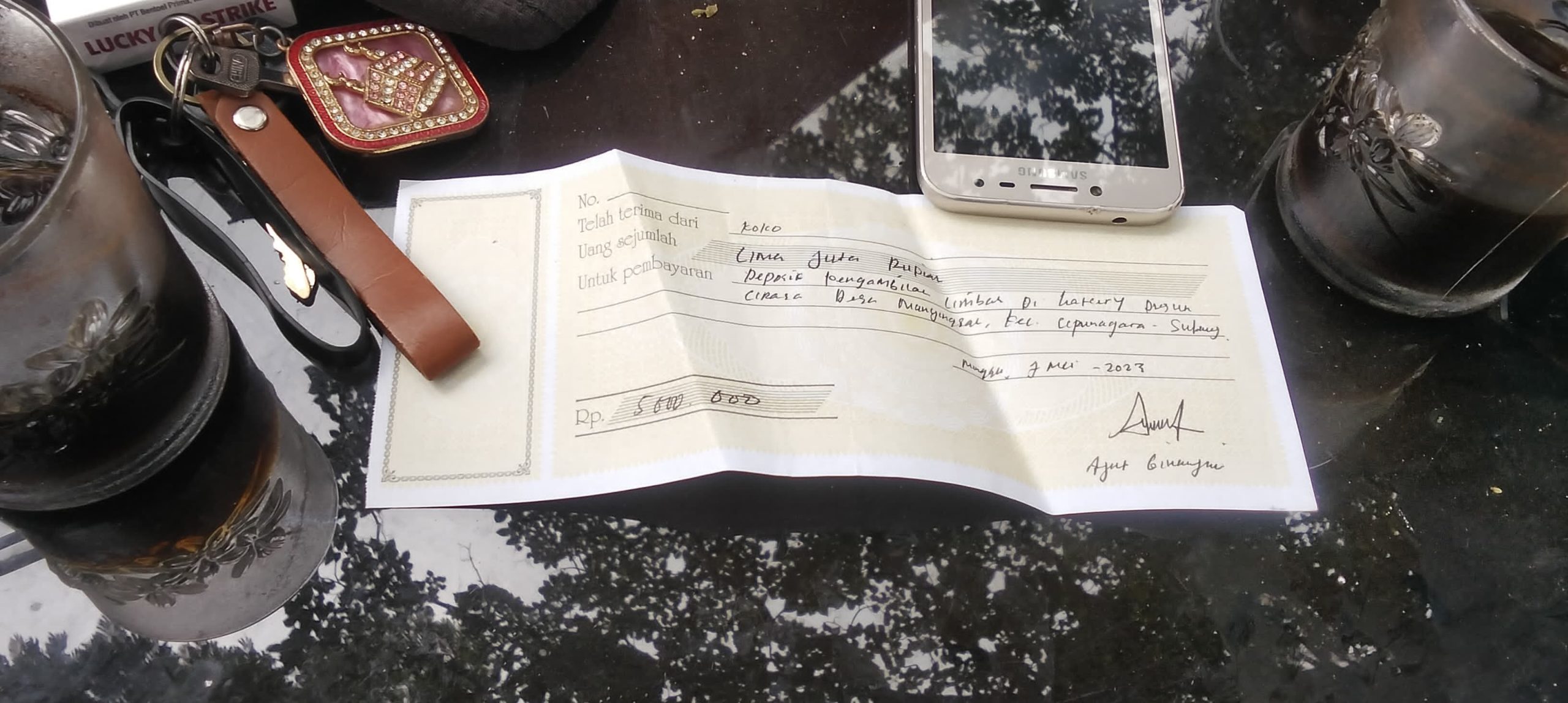 “Karena harus ada Deposit dan tanda jadi untuk pengambilan limbah tersebut akhirnya apa yang dikatakan Oknum Kadus Saya turuti hingga Saya memberikan DP awal senilai Rp.5 juta rupiah sebagai tanda jadi (Deposit pengambilan limbah) dan itu terlampir di atas kwitansi pada 7 mei 2023.” jelas Koko.